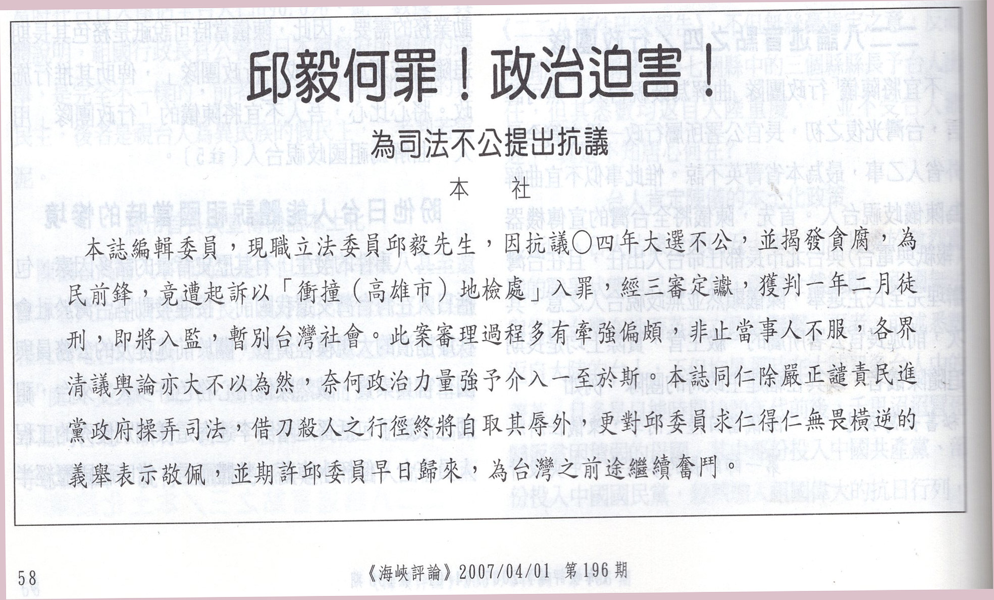 隨著中華民國總統大選與北京二○○八奧運的接近,在台灣,內有陳水扁的渾水摸魚、乘亂脫身,外有華府的張隻眼閉隻眼與東京極右派的慫恿,島內台獨勢力從四要一沒有到陳明通憲法草案的提出,頗有加速推進之勢。本期熊玠、陳毓鈞兩教授與紀欣女士的大作就這一形勢各抒己見。李壽林先生駁台獨的「影武者」日本人宋重陽(宗像隆幸)的台獨論則一針見血指出:「日本如真心支持台獨……只須日本政府承認台灣是一主權獨立國家,而與之建立『邦交』即可。」何必鼓動民進黨台獨,去踩中共紅線。◆
