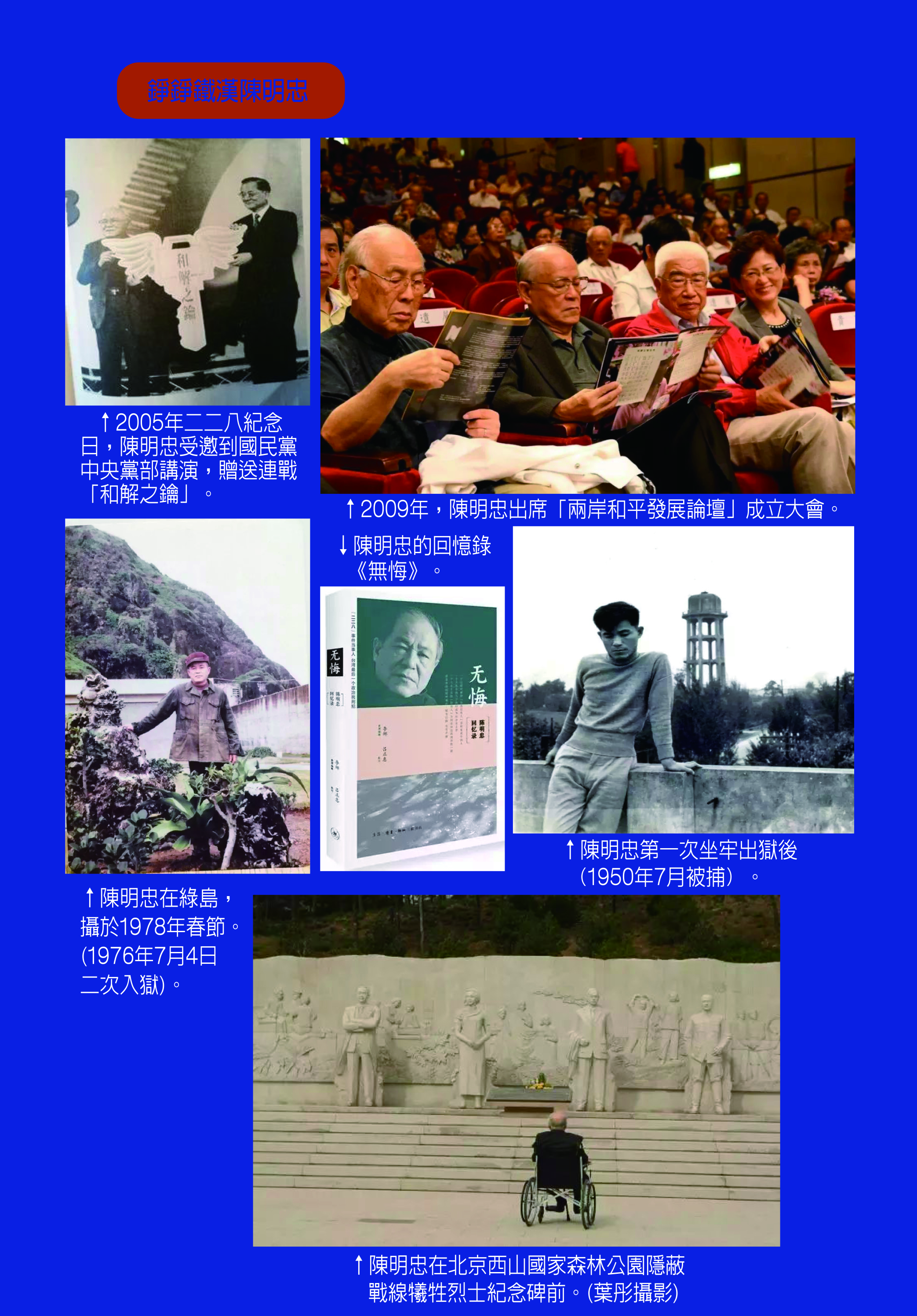 我第一次見到陳明忠老先生是在1996年。那年初,我應「政大東亞所」之邀首次赴台參訪。期間,我專程去「統盟」拜訪,與王津平、王曉波等朋友座談,陳老先生也來了。陳老先生給我留下了和謁可親、溫文爾雅、忠厚長者的印象。後經朋友介紹,才知道他曾兩次被捕,蹲過國民黨21年的黑牢,這頓時令我肅然起敬。然而我真正瞭解陳老先生,那還是近年來讀到《無悔--陳明忠回憶錄》之後。