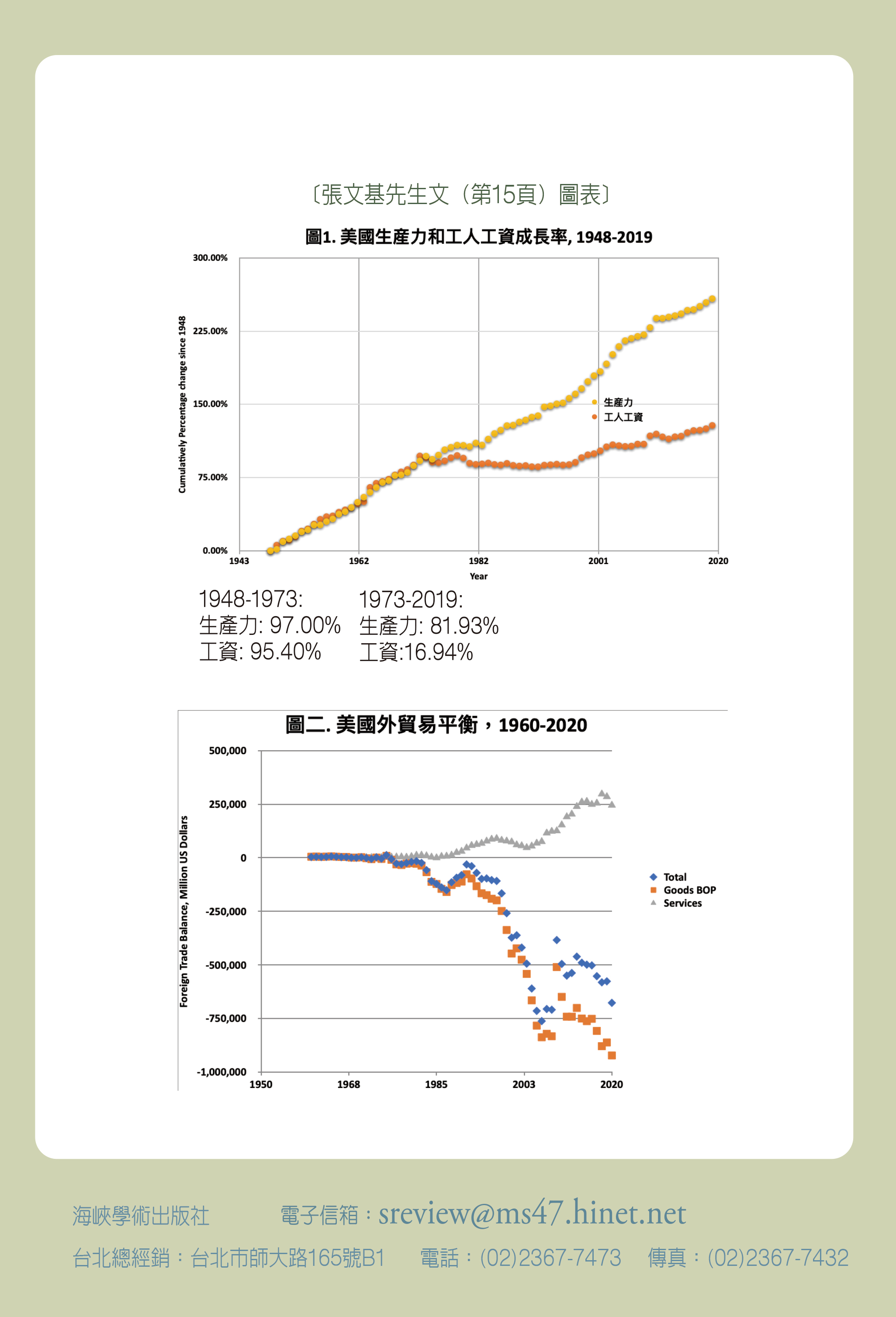 圖二〔見封面裡〕顯示從1960年到2020年美國商品、服務及兩者相加的貿易平衡數據。