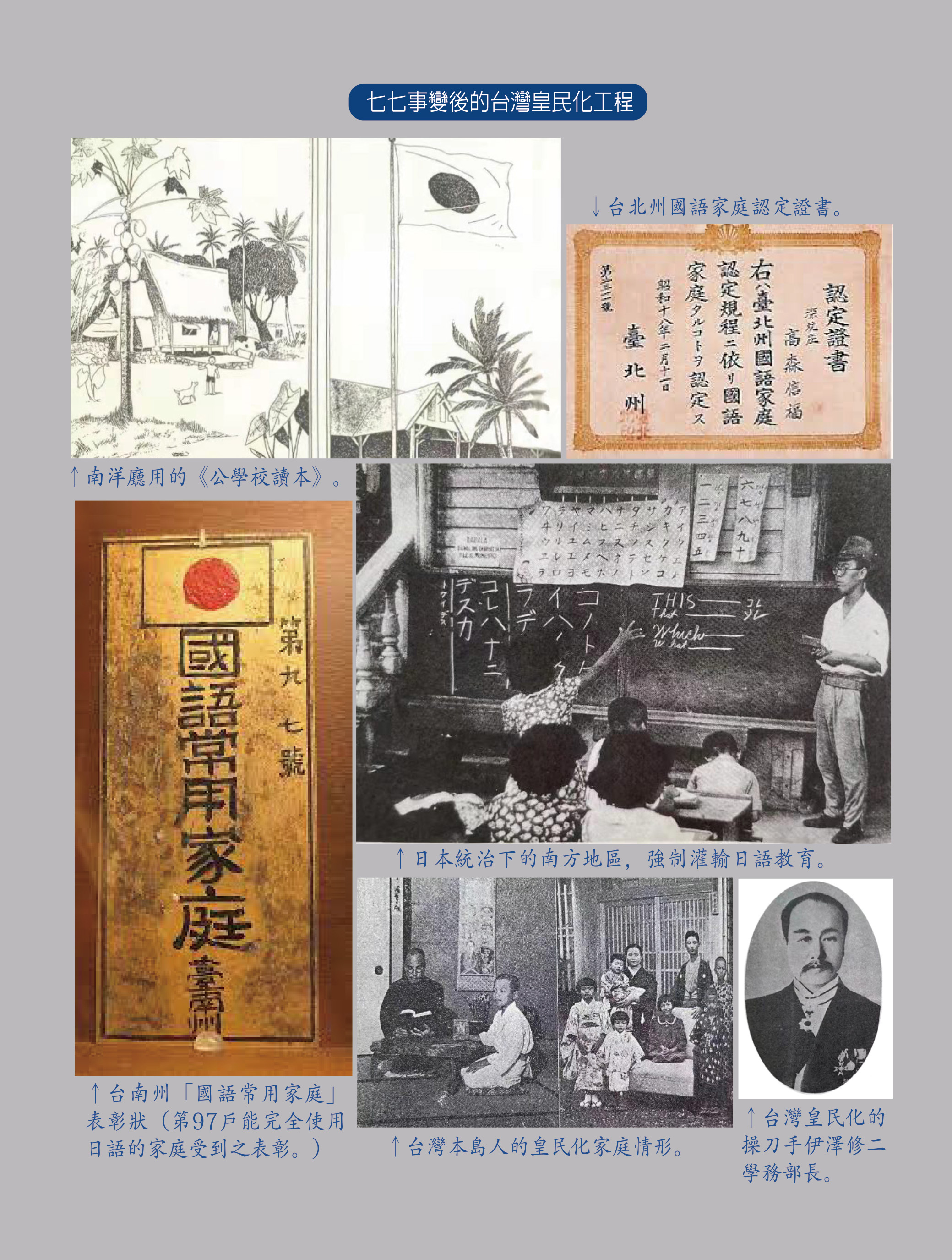 為了在台灣全面推行「皇民化」教育,日本殖民當局通過學校、社會、家庭「三維一體」手段,企圖徹底改造台灣人民的中華意識與國族認同,實現台灣人的「日本化」與「皇民化」。