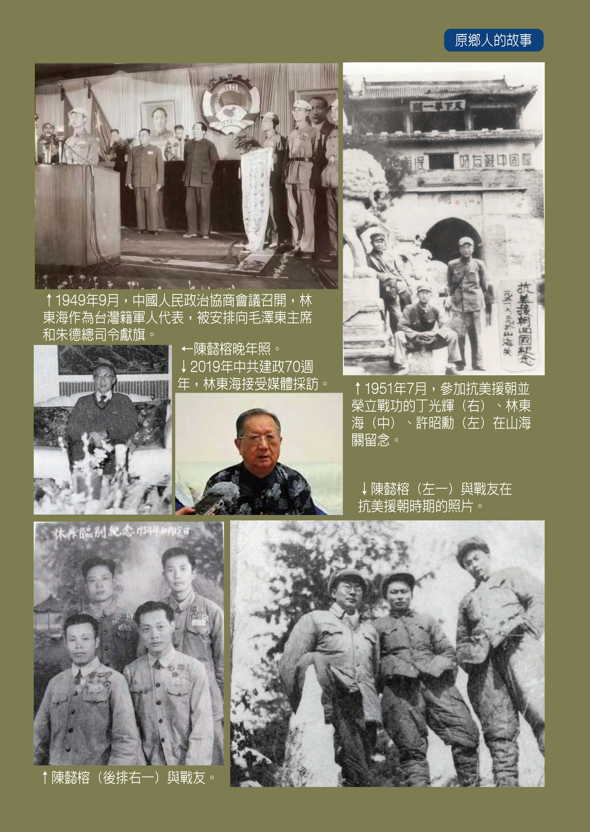 1950年,朝鮮戰爭爆發。林東海積極響應「抗美援朝,保家衛國」的偉大號召,從福建前線北上,作為中國人民志願軍的一員,第一批赴朝作戰,在兵團司令部情報處擔任戰地地形和敵情偵察工作。像大多數從日據時期過來的老台胞一樣,林東海講得一口流利的日語。語言,只是一種交流的工具,會日語,曾給林東海帶來過便利,但在朝鮮,也給他帶來過誤會和麻煩。