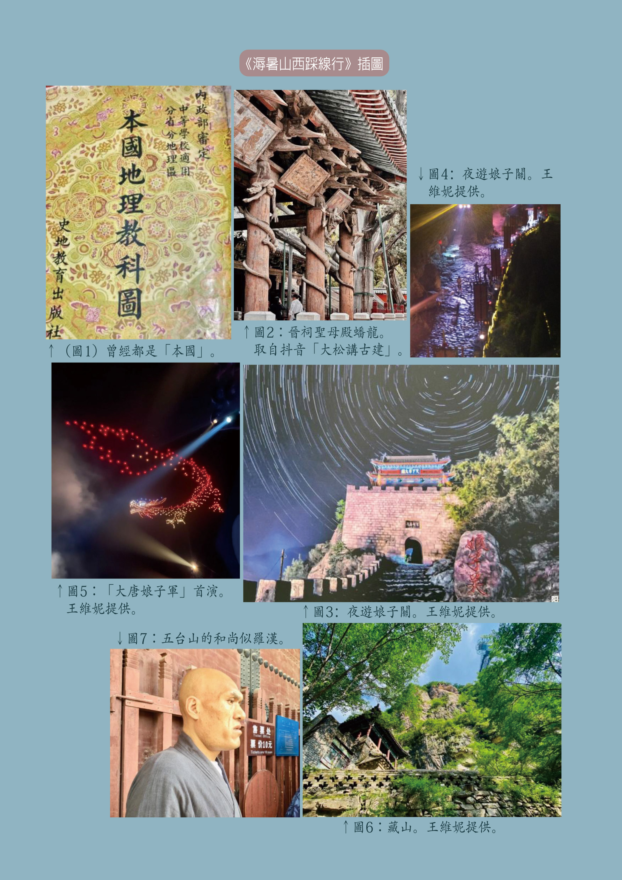 次日要登臨五台山,這是我最期待的景點。豈知因為塞車,上山花了好多時間,等到真正進山時,只參觀了三座寺廟--顯通寺,塔院寺(地標白塔在維修,被鷹架包覆)和萬佛閣(五爺廟)。時值暑假,五台山上萬頭鑽動,許願的,還願的,人山人海,可以說什麼也沒看到,什麼也沒拜到,清涼山不清涼,只記得收門票的和尚長得很像羅漢(圖7)。下山又是塞車,花了整整一天,什麼感覺也沒捕捉到,我對五台山很失望。