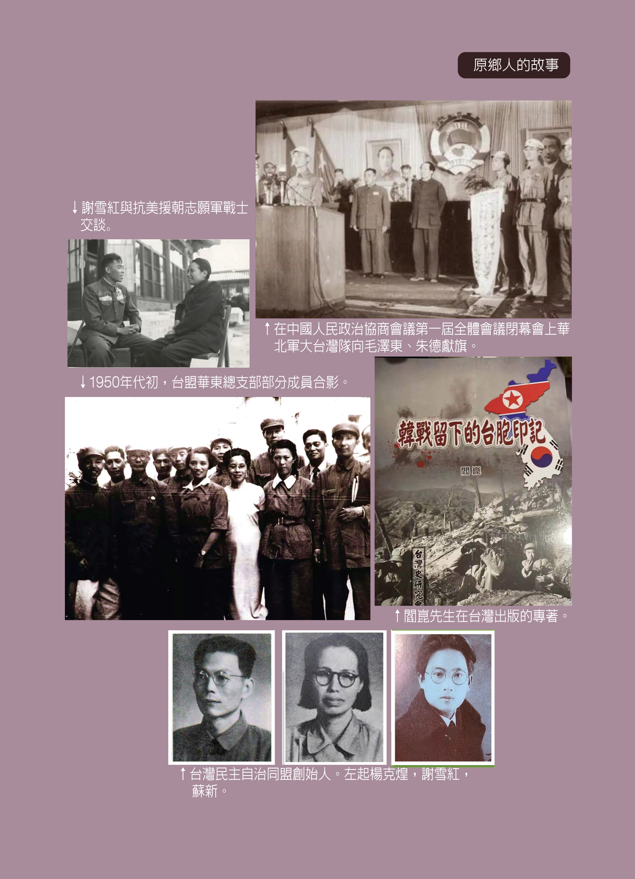 1951年10月30日,台盟主席謝雪紅在全國政協第一屆三次會議上發言:台灣人民深刻理解抗美援朝的正義性,他們知道在朝鮮前線大量消滅帝國主義侵略勢力的勝利將是解放台灣的有利條件。謝雪紅表示,一年來抗美援朝的勝利,鼓舞了台灣人民,使他們堅信台灣一定要解放,推動了他們加緊準備解放台灣的工作。