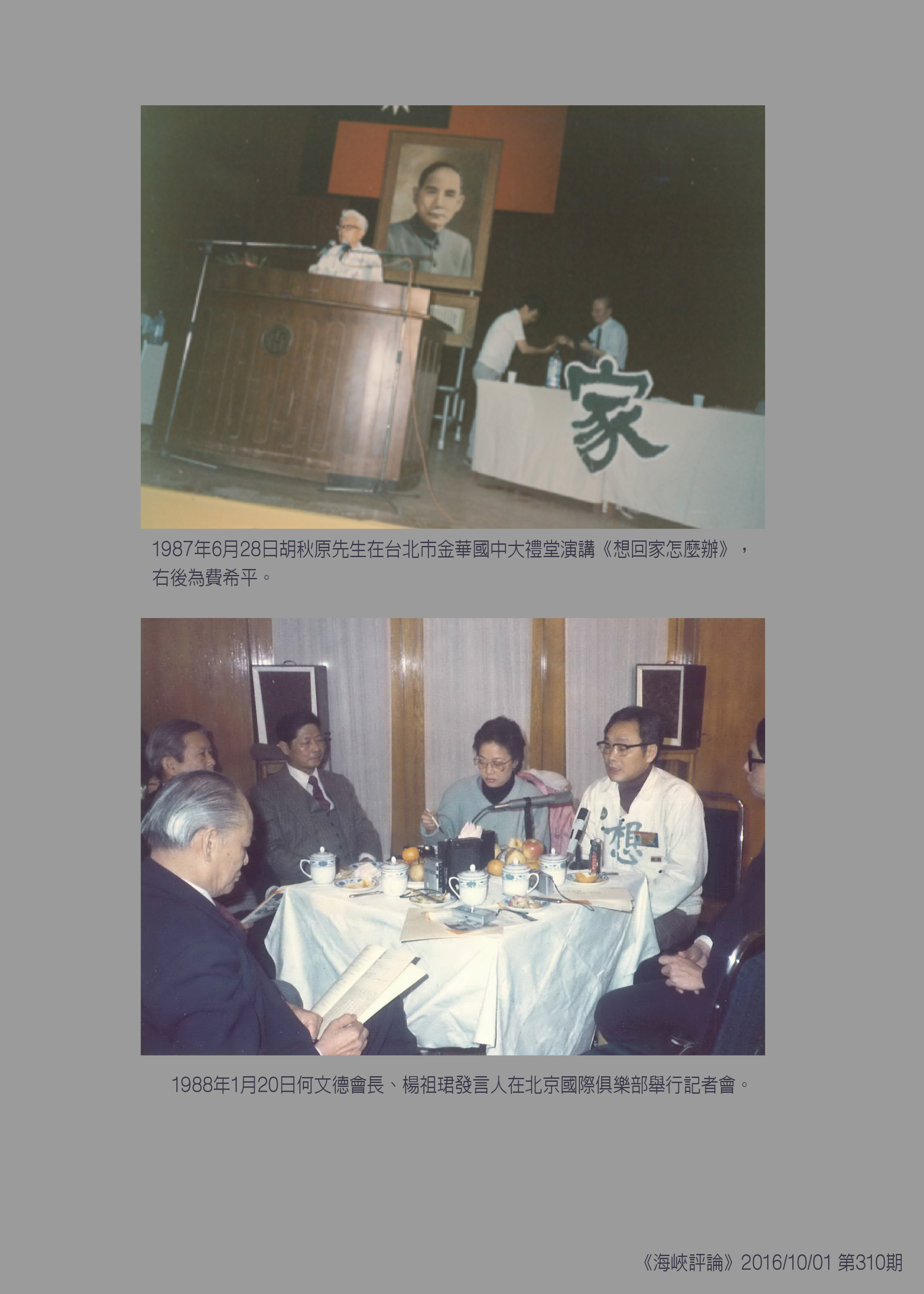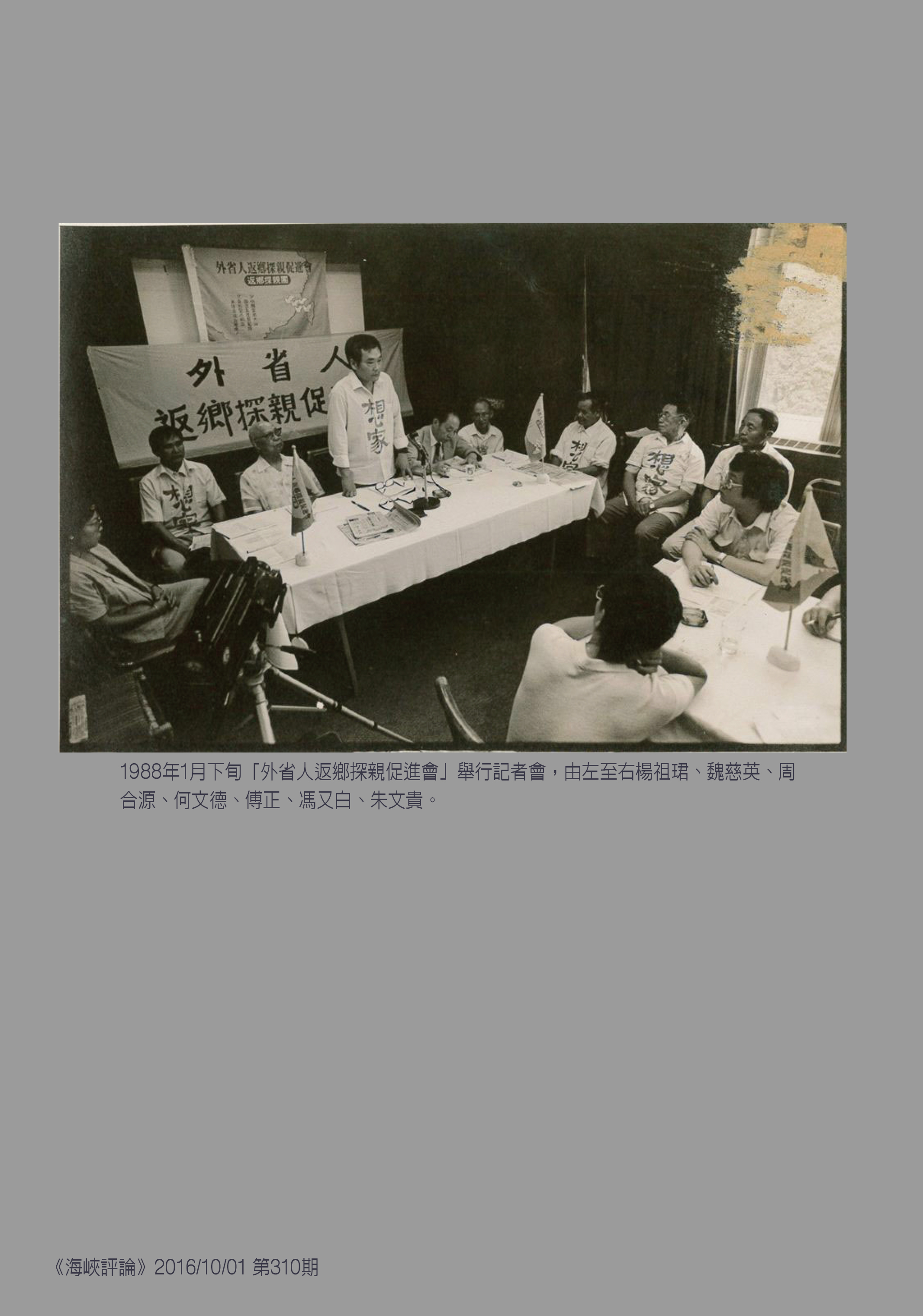 ↓(上)1988年1月上旬「外省人返鄉探親促進會」舉行記者會,由左至右楊祖珺、魏慈英、周合源、何文德、傅正、馮又白、朱文貴。(下)1988年1月20日何文德會長、楊祖珺發言人在北京國際俱樂部舉行記者會。