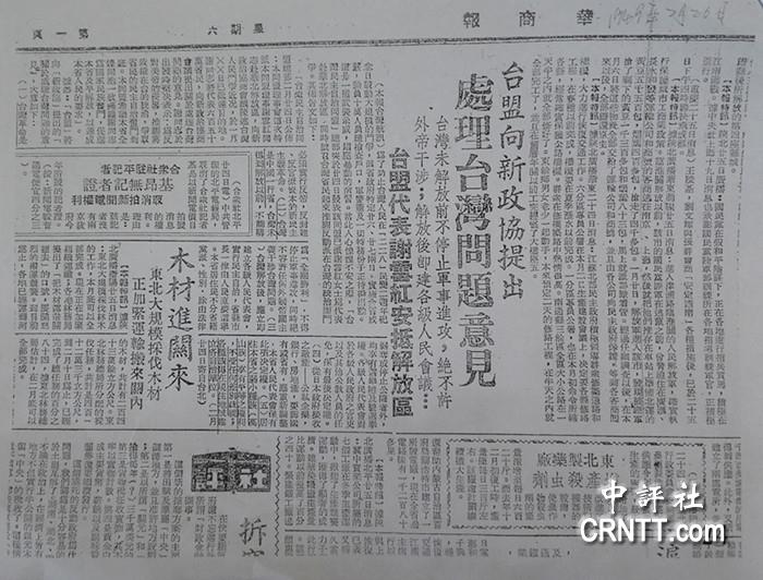 1949年2月26日,香港《華商報》以《台盟向新政協提出處理台灣問題意見為題》(圖二)(中評社圖片)