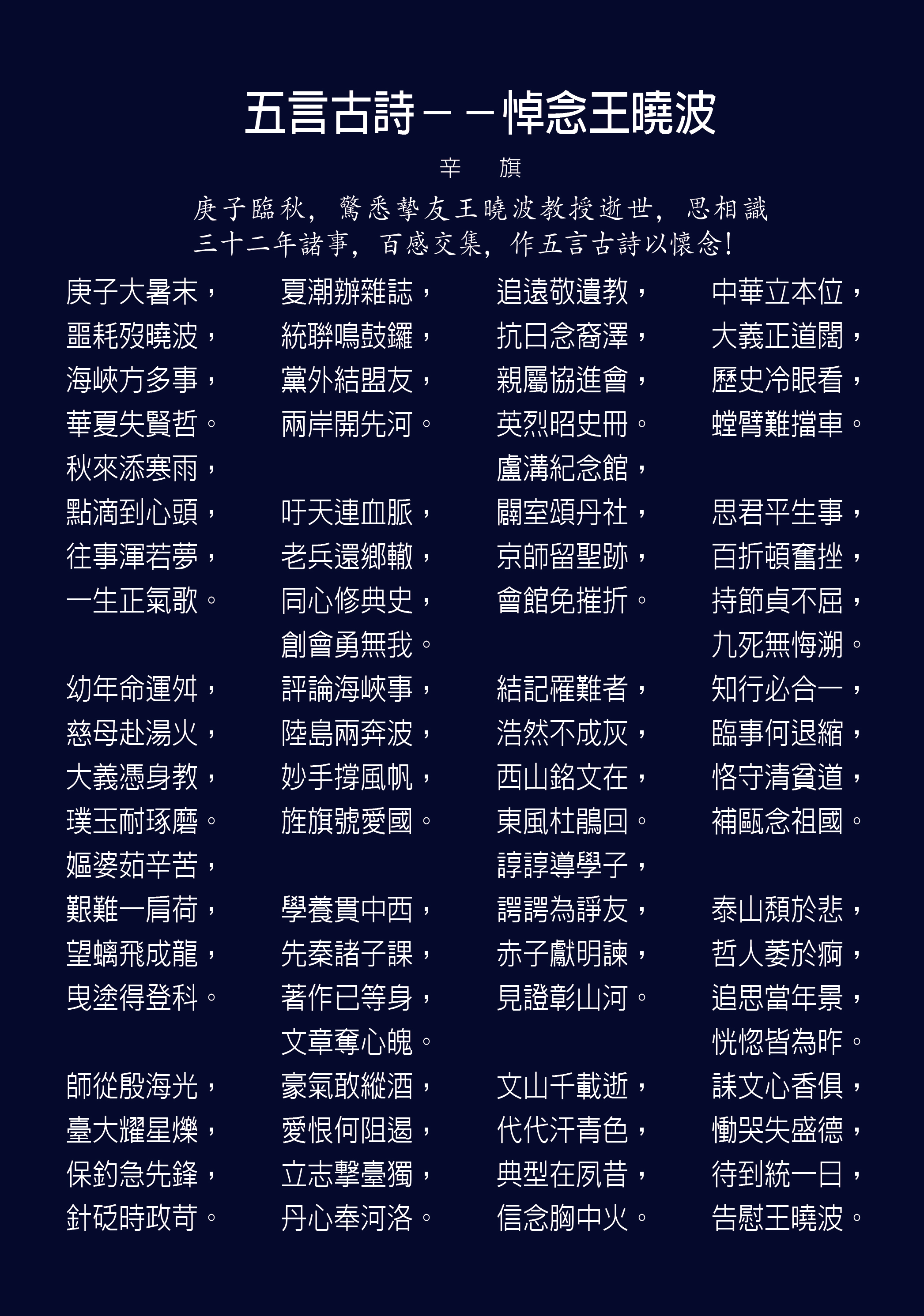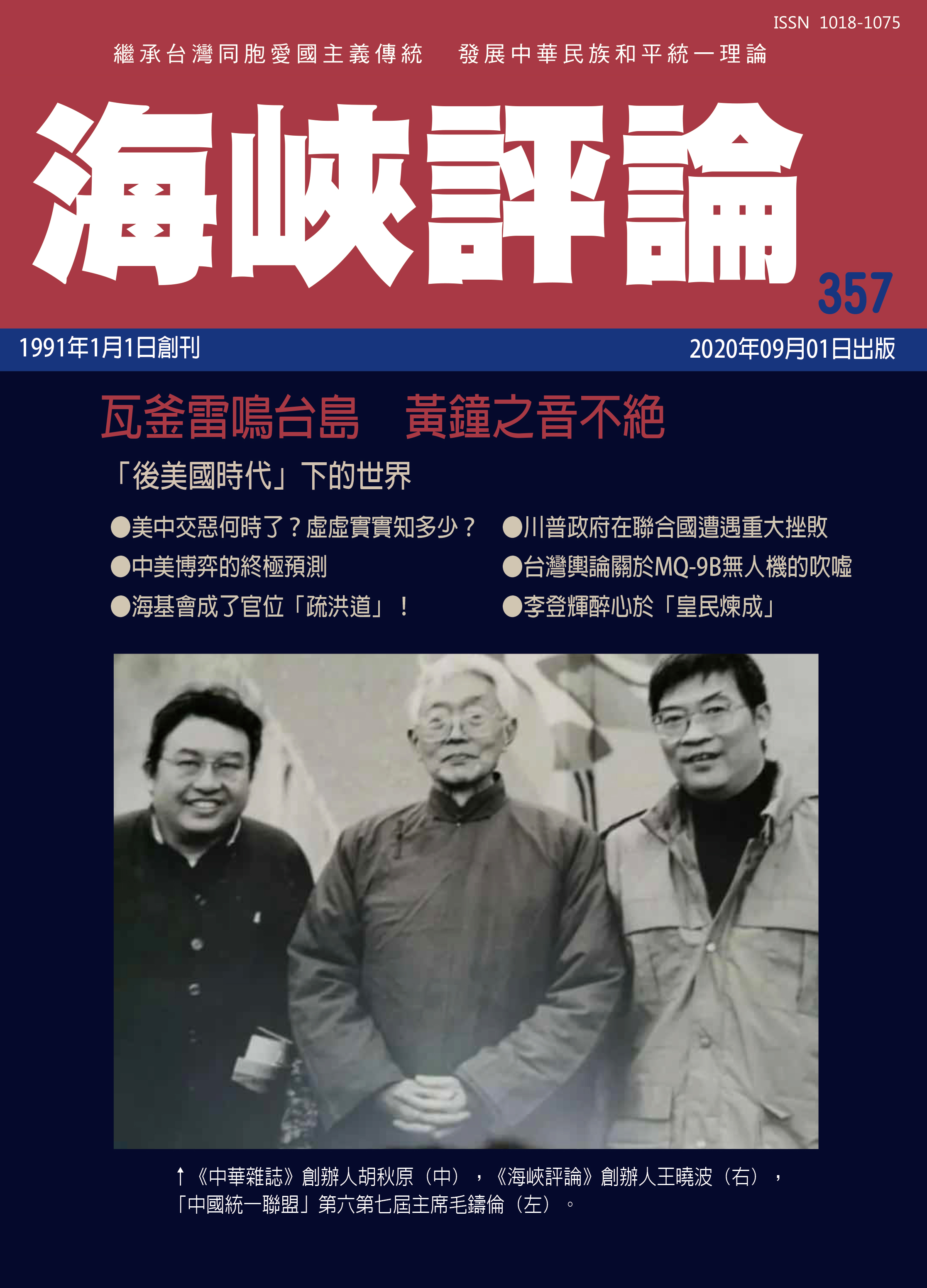 2020年7月30日,本誌創辦人王曉波教授去世;同月28日曾任本誌副總編輯多年的毛鑄倫先生去世;8月13日本誌編輯委員曾健民先生去世。不到一個月時間,創辦人與兩位曾為本誌付出過心血的愛國志士先後離去,我們致以沉痛的哀悼之餘,誓將以更堅定的步伐,繼續他們的志業,為國家的和平統一與民族的復興不懈奮鬥。